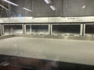 2025年10月20日〜24日に防災科学技術研究所新庄雪氷環境実験所で吹雪に関する風洞実験を実施しました.雪面に作用する微小応力を計測するという敏感な実験でしたが,貴重なデータを得ることができました.写真は,実験最終日に降雪装置を使用している様子です.